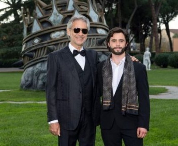 ROME, ITALY - NOVEMBER 21: Singer Andrea Bocelli and actor Toby Sebastian attend "The Music of Silence" by Michael Radford. On set with Andrea Bocelli and AMBI Media Group producers at Cinecitta on November 21, 2016 in Rome, Italy. (Photo by Venturelli/Getty Images)