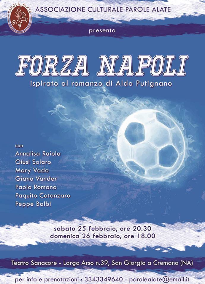 San Giorgio a Cremano. “Forza Napoli”: è questo il titolo dello spettacolo, ispirato al romanzo di Aldo Putignano, che la compagnia teatrale Parole Alate porterà in scena il prossimo 25 e 26 febbraio al teatro Sanacore di San Giorgio a Cremano.