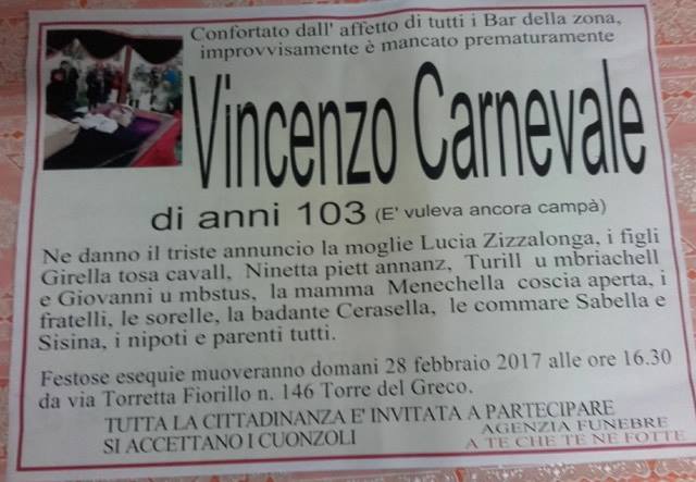 Sul manifesto mortuario si legge che a darne la notizia sono la moglie Lucia Zizzalonga, i figli Girella tosa cavalli, Ninetta pietto annanze, Turillo ‘o mbriachiello e Giuvanne ‘o mbustuso, la mamma (chissà quanti anni avrà!) Menechella coscia aperta, i frateli, le sorelle, la badante Cerasella, le commare Sabella e Sisina, i nipoti ed i parenti tutti. Agenzia funebre: A Te Che Te Ne Fotte!