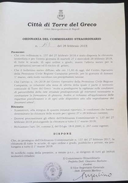 Il Comune di Torre del Greco, a seguito del bollettino meteo diffuso dalla Protezione Civile, ha prorogato la chiusura degli istituti scolastici fino a domani, giovedì 1 marzo. Di seguito, la delibera ufficiale: