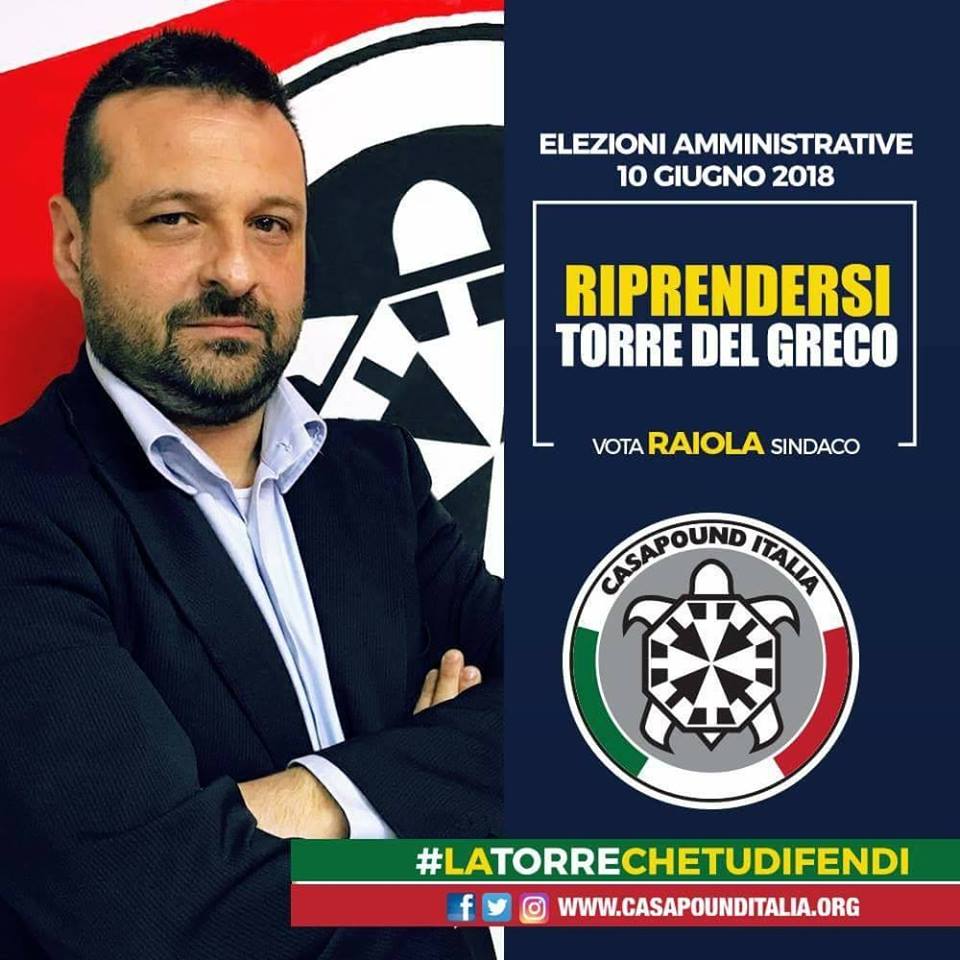 Le elezioni si avvicinano, è tempo di familiarizzare con candidati e progettualità. Anche CasaPound Italia, il movimento d’estrema destra diventato negli ultimi anni un vero e proprio partito di rilevanza nazionale, concorrerà alle amministrative di Torre del Greco: è dal 2013 infatti che , dopo un breve periodo di rodaggio in appoggio a civiche di centro-destra, il partito partecipa con una propria, autonoma lista alle elezioni, a livello sia nazionale che locale. Il candidato schierato dalla lista della tartaruga frecciata è Ferdinando Raiola, coordinatore regionale campano di CasaPound . -Abbiamo voluto mettere il “pubblico” al centro del nostro programma , chiaro che va messo in mano a persone competenti ma di certo non si può pensare di risolvere sempre ogni cosa svendendo ai privati. Il nostro obiettivo è mandare in consiglio comunale delle persone pronte ad alzare la voce ogni qualvolta si gioca sulle pelle dei torresi. Quanto accaduto nella scorsa legislatura, dove ogni consiglio comunale era una lotta tra ricatti, contentini e accordi non propriamente trasparenti con noi in consiglio non accadrà più. I torresi non devono però essere fatalisti, il “tanto non cambia nulla” non esiste, devono destarsi e tornare artefici del proprio destino. Come? Iniziando a scegliere tra il contentino di un momento elargito dai soliti poltronari e il futuro loro e dei propri figli- dichiara il candidato.