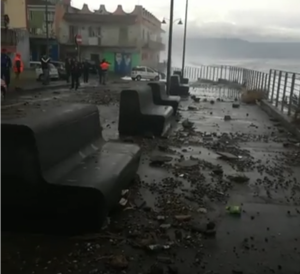 Da come si vede nel video postato Gualtieri Savio, nella città corallina di Torre del Greco, le onde del mare spinte da forti raffiche di vento hanno inondato il passeggio del lungo mare, depositando detriti di vario genere e causando danni o distruggendo tutto quello che la furia funesta del mare incontrava sul suo cammino.