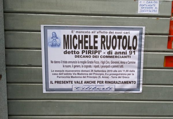 Torre del Greco -E’ venuto a mancare oggi Michele Ruotolo, commerciante storico di Torre del Greco, meglio conosciuto da tutti con il soprannome di “Piripì”. L’uomo aveva 91 anni. Un manifesto funebre è stato esposto sulla serranda della nota tabaccheria in via Roma n. 25.