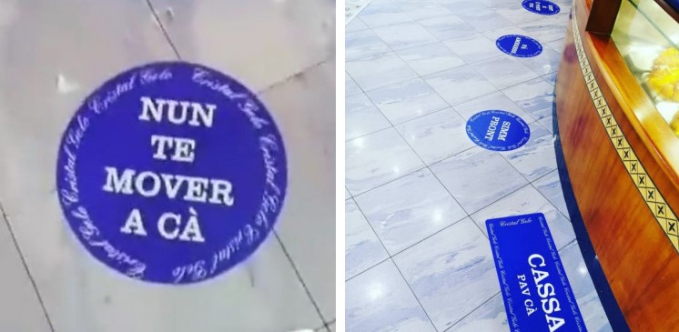 In questo modo, il contagio da Coronavirus viene evitato seguendo la segnaletica in napoletano: “Nun te movere ‘a ccà”, “Fa’ ambressa”, “Simme pronti”, sono solo alcune delle divertenti frasi utilizzate. Queste e tante altre, apposte su degli adesivi, riempiono gli spazi destinati al consumo al banco, alla cassa, all’ingresso e all’uscita del bar.
