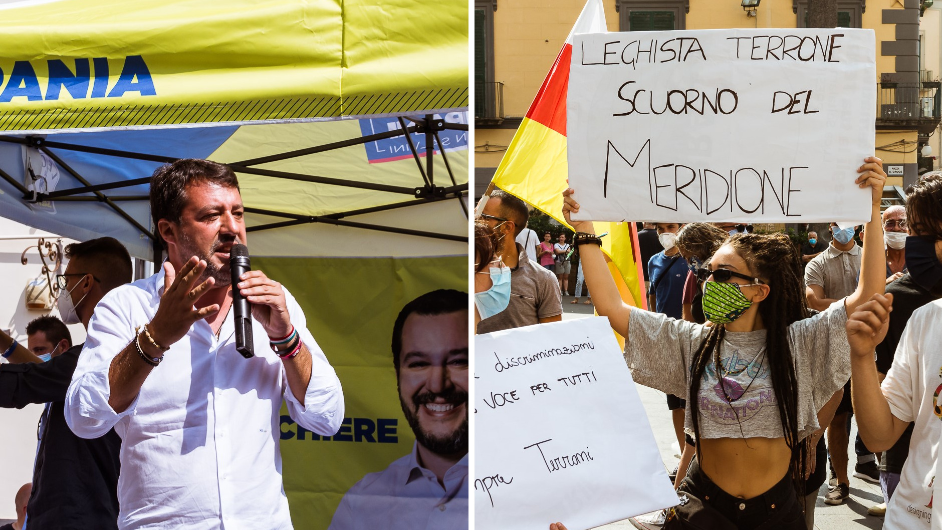 Matteo Salvini ha parlato pochi minuti, senza esprimere alcun contenuto rilevante. Ha affermato che il problema di Torre del Greco non è la Lega ma la camorra, accusando i contestatori – in sostanza – di essere conniventi o comunque passivi nei confronti della criminalità organizzata: una sorta di “o sei con me, o sei (simpatizzante) camorrista”. Poi gli slogan contro De Luca e la Azzolina, che avrebbero distrutto la Campania e la scuola, e l’annuncio di una sua visita a Giugliano. Torre del Greco, dunque, praticamente assente dal suo discorso, merito anche dei politici locali incapaci – evidentemente – di informare il loro segretario dei problemi della città in modo da non fargli fare una figuraccia.