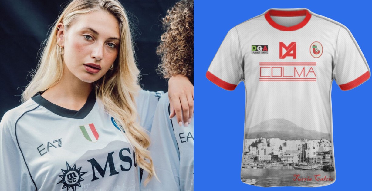 Da premettere che la Turris quella stagione anche per la maglia di casa presentava il Vesuvio sullo sfondo, ma la nostra concentrazione va sulla seconda, anch’essa bianca come quella del Napoli. Entrambe hanno il Vesuvio nella parte bassa con il main sponsor subito sopra; nel caso di quella degli azzurri il logo di MSC copre parte della grafica. Per entrambe le maglie il disegno è in grigio e ci sono sia il Vesuvio che il mare che simboleggiano le due città.