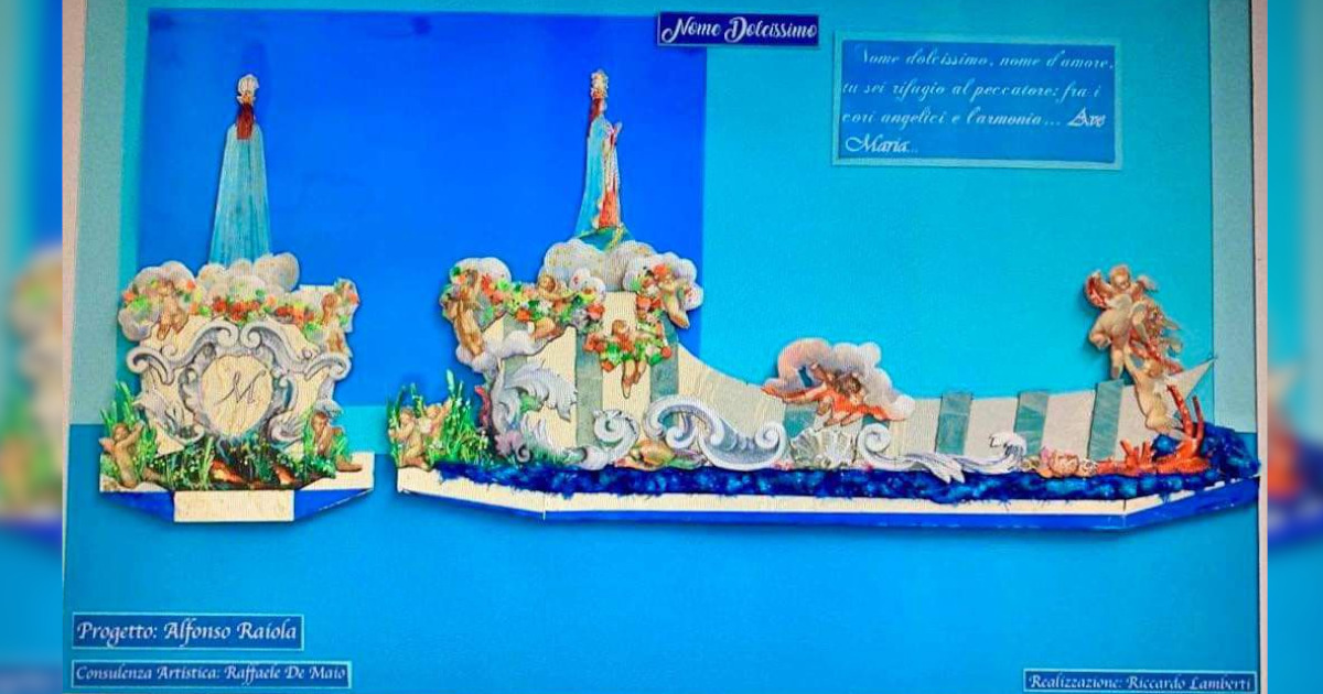 “Nome dolcissimo” è il titolo scelto per il carro: più che un bozzetto si tratta di un vero rendering. Il progetto è stato realizzato da Alfonso Raiola, con la consulenza artistica di Raffaele De Maio. La realizzazione, che comincerà già dalle prossime settimane, sarà affidata alla maestria di Riccardo Lamberti come già avviene da decenni.