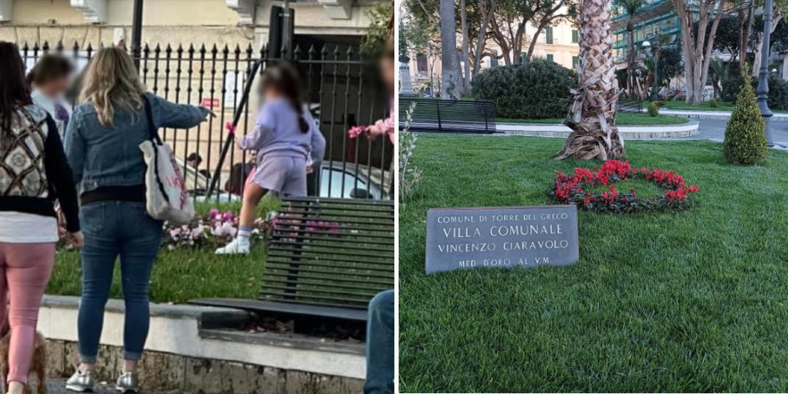 Inciviltà a Torre del Greco, bambini lasciati camminare sulle aiuole della "Villa Ciaravolo"