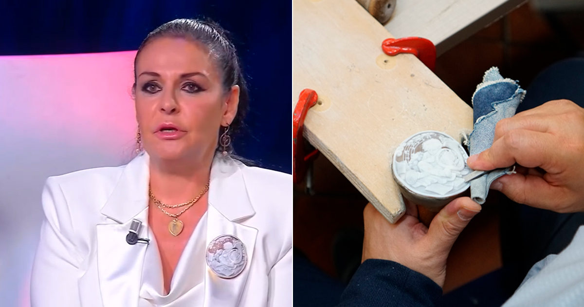 Durante la trasmissione, Daniela Di Maggio ha indossato un cammeo molto speciale, realizzato dagli artigiani torresi in occasione della Notte Sacra di Torre del Greco, nell’autunno scorso. Infatti, durante questa manifestazione, in maniera volontaria, alcuni artisti dell’Assocoral hanno voluto omaggiare la famiglia del caro Giogiò, realizzando ognuno una propria opera e consegnata nelle mani del padre Franco Cutolo.