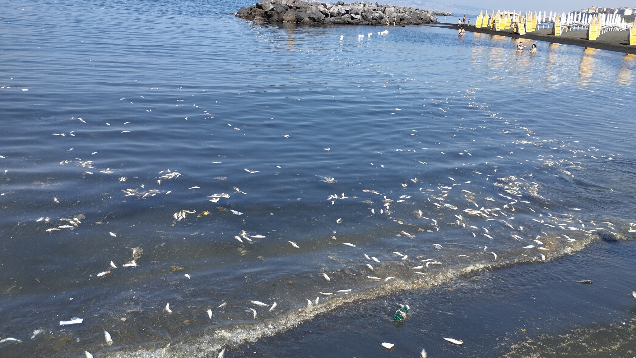Migliaia di piccoli pesci morti, che galleggiavano sull’acqua proprio sul bagnasciuga della Litoranea torrese, a pochi metri dalle persone che senza troppo curarsene si stavano facendo il bagno.