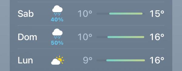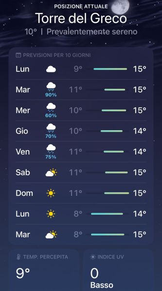 30 novembre, ore 22.00 – Prima previsione a lungo termine, il meteo per l’8 dicembre si preannuncia sereno (fonte Apple Meteo).