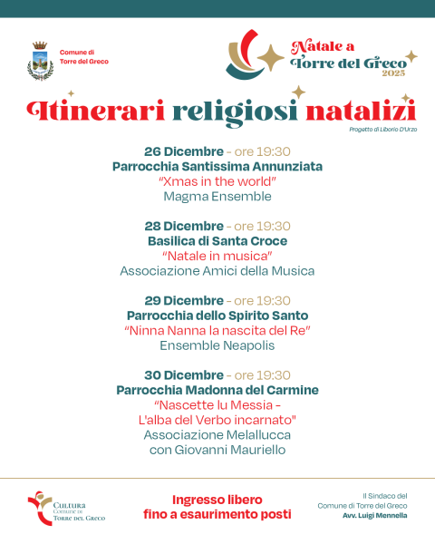 Tutti gli eventi rientrano nel cartellone natalizio organizzato dal comune di Torre del Greco grazie all’impegno profuso dall’Ufficio Cultura e saranno ad ingresso libero fino ad esaurimento posti.