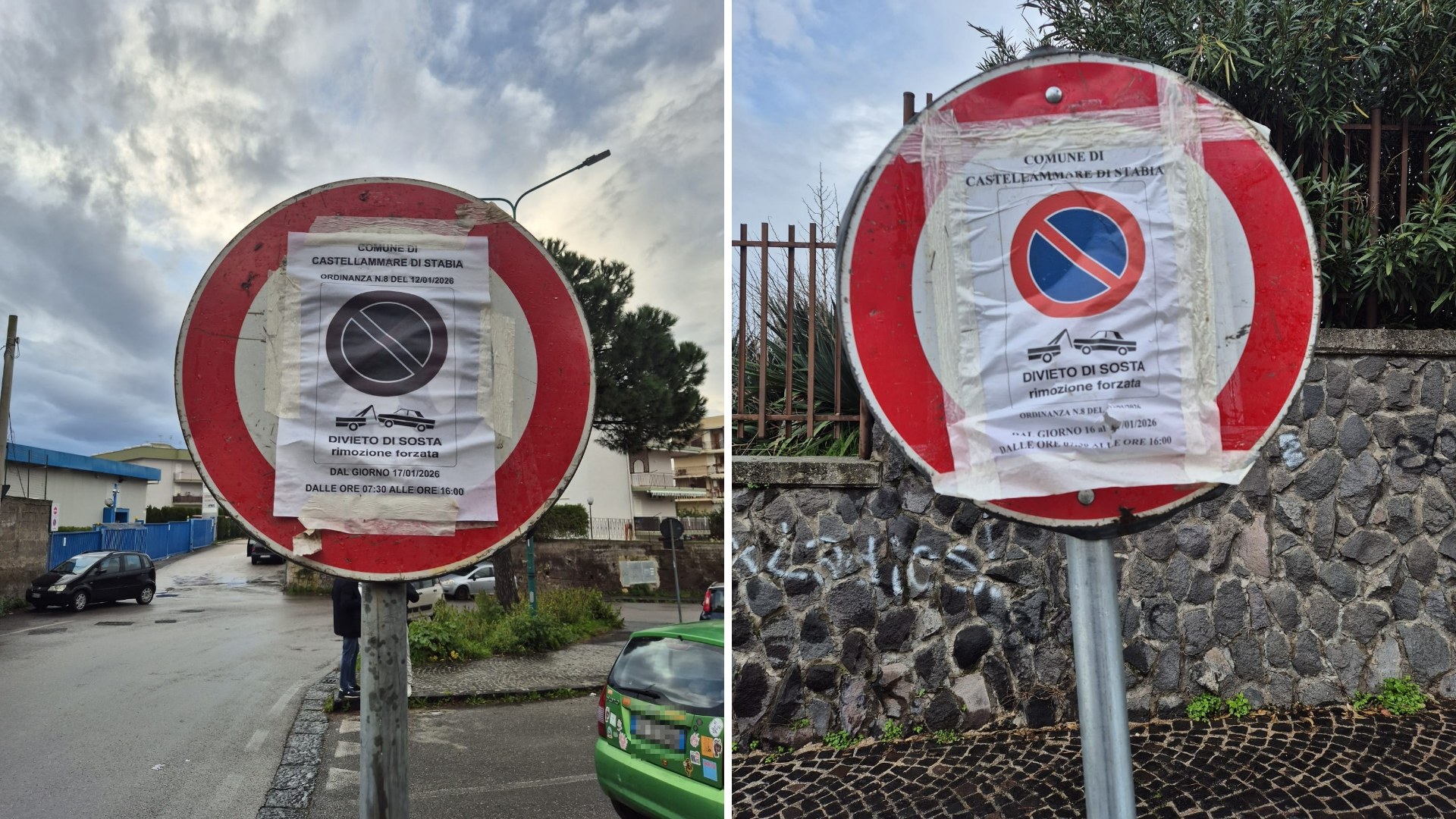 Cartelli stradali provvisori di divieto di sosta sono spuntati in via Cavallerizzi a Torre del Greco: nulla di strano se non il fatto che suddetti cartelli sembrano essere stati emessi dal comune di Castellammare di Stabia.