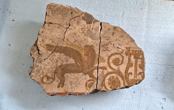 Tra le scoperte più affascinanti ci sono frammenti pittorici dalle pareti e dal soffitto, dove si distinguono fasce rosse di cinabro animate da figure di aironi e motivi mitologici, fino a grifi e centauri in movimento: un repertorio visivo che rivela raffinatezza e ricercatezza estetica. All’interno dell’ambiente sono emerse anche tre ciste in piombo finemente decorate e elementi in marmo bianco di alta qualità, chiaramente predisposti per ulteriori interventi architettonici, segno di un cantiere in piena attività al momento della tragedia vesuviana.