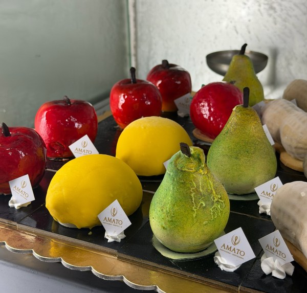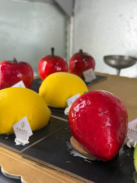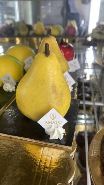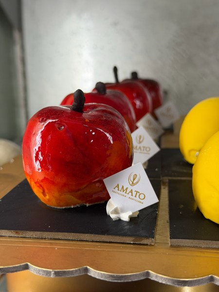 Si tratta di una lavorazione chiamata trompe-l’œil, ovvero “inganno dell’occhio”: il dolce viene modellato per sembrare esattamente un frutto vero. Colori, forma e texture della buccia vengono riprodotti con grande precisione. “È un prodotto anche ‘scenografico’, le persone amano fotografarlo e, a volte, si ha quasi timore a tagliarlo per quanto è bello. Ma ne vale la pena perché il sapore è eccezionale”, spiega Ivan Amato.