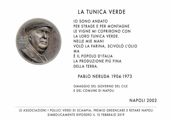 Con l’occasione, verrà simbolicamente affissa una copia della targa realizzata dalla Città di Napoli e dal Governo del Cile che riportava una poesia di Pablo Neruda, in ricordo della sua permanenza in Italia, targa collocata nel 2002 al Parco Virgiliano, rimossa da ignoti e mai più ripristinata. Alla presenza del Console onorario del Cile, Maurizio Di Stefano, l’attrice Gea Martire leggerà alcuni brani tratti dal libro “La prima luce di Neruda” di Ruggero Cappuccio, selezionati dall’autore stesso e che testimoniano il legame con Napoli del poeta cileno, Premio Nobel per la Letteratura.