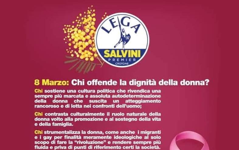 Secondo i leghisti calabresi il “ruolo naturale” della donna sarebbe quello “volto alla promozione e al sostegno della vita e della famiglia”, in parole povere procreare, crescere i figli, accudire il marito. La donna, infatti, per sua attitudine naturale sarebbe destinata a tali mansioni.