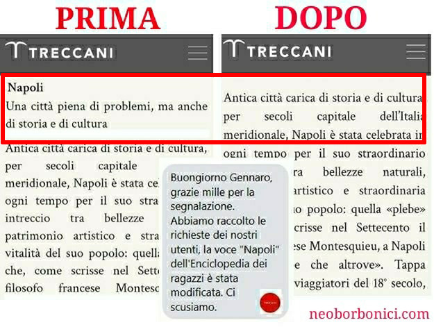 A essere soddisfatto è in particolar modo il presidente dei neoborbonici, Gennaro De Crescenzo, che su Facebook ha aggiunto: “Restano diverse notizie non condivisibili sui “sovraffollamenti” (tipici di altre città) o sulla “criminalità” (diffuse dappertutto) ma resta, grazie a tutti noi e a tutti voi, la soddisfazione di aver ricevuto le scuse e di aver cancellato un “titolo” che ha fatto e avrebbe fatto danni all’immagine della nostra capitale e di una delle città più belle del mondo. È anche così ed è anche combattendo contro luoghi comuni e preconcetti che, prima o poi, si risolveranno le questioni meridionali… Andiamo (ovviamente) avanti!”.