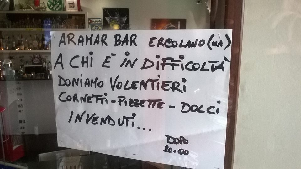 L’Aramar bar di Ercolano, infatti, ha esposto in bella vista un cartello con scritto “A chi è in difficoltà doniamo volentieri cornetti, pizzette, dolci invenduti”.