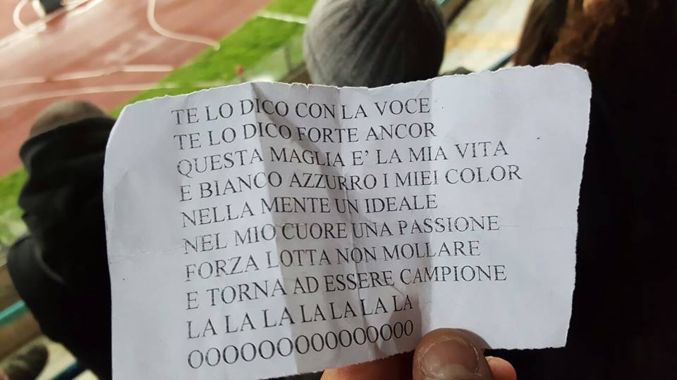 Contro il Sassuolo, infatti, sugli spalti del tempio azzurro ci sono state le “prove generali” di quello che si preannuncia come un vero successone tra i tifosi azzurri. Questo il testo: “Te lo dico con la voce, te lo dico forte ancor. Questa maglia è la mia vita, e bianco azzurro i miei color. Nella mente un ideale, nel mio cuore una passione. Forza lotta e non mollare, e torna ad essere campione!“. Di seguito uno dei primissimi video che sta già facendo il giro del web: