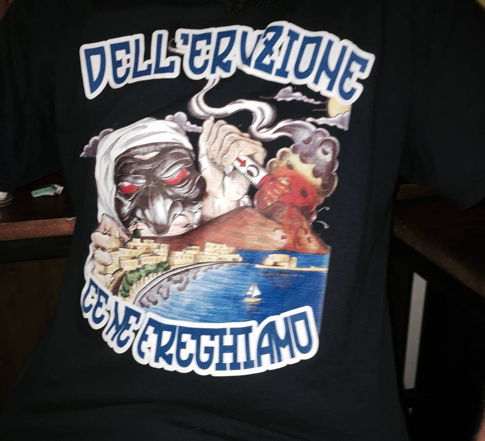 Oltre alla scritta viene raffigurato il golfo di Napoli con la maschera di Pulcinella che sovrasta il Vesuvio con un fumogeno che vorrebbe rappresentare l’eruzione.
