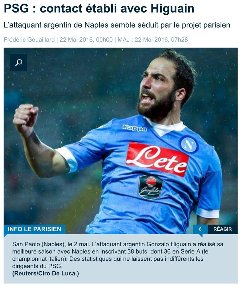 Secondo il racconto, l’incontro tra Nicola Higuain, fratello e agente del Pipita, e Olivier Letang, dirigente del Paris Saint-German, sarebbe avvenuto la scorsa settimana. Non ci sono altre notizie riguardo al corteggiamento che lo stesso quotidiano transalpino ricorda esserci stato già nella stagione 2012 quando l’attuale attaccante del Napoli vestiva la maglia del Real Madrid.