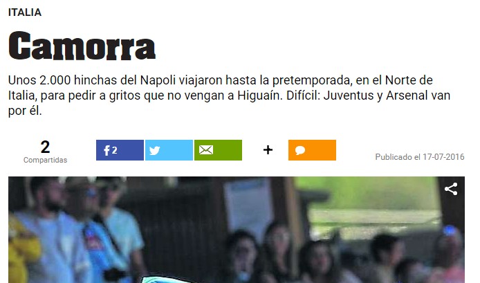 Il titolo è “Camorra“. All’interno del pezzo (CLICCA QUI) si legge testualmente “se armò la camorra“, tradotto “la camorra si armò“. Il giornale si riferisce all’invasione dei tifosi azzurri a Dimaro, che in maniera pacata e civile stanno chiedendo lumi sulla possibile cessione della punta argentina. Dagli spalti si è levato il classico coro “chi non salta juventino è” e qualche altro coro inneggiante a Higuain.