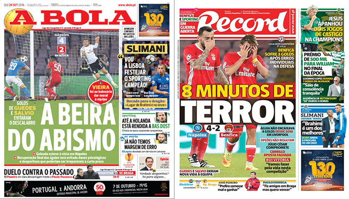 Anche la stampa portoghese ha esaltato il Napoli, a discapito del Benfica. A Bola distrugge la prestazione del Benfica, titolando così: “Sull’orlo dell’abisso“. Dello stesso tenore anche Record, che ci va giù pesante: “8 minuti di terrore“. Anche all’estero, insomma, si esalta il gioco del Napoli, unica italiana finora a punteggio pieno e con un piede già agli ottavi della competizione.
