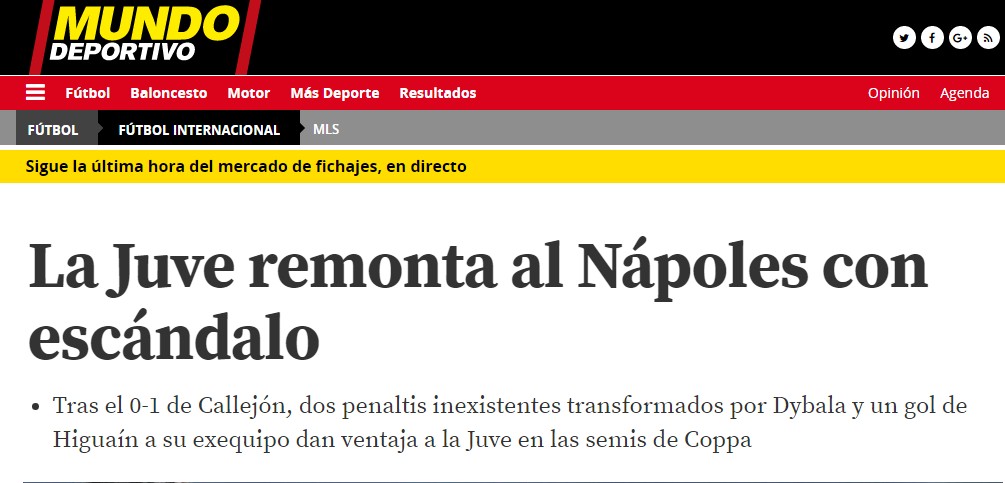 Fa notizia il commento del quotidiano sportivo El Mundo Deportivo che, a proposito delle controverse decisioni arbitrali, titola così: “La Juventus rimonta il Napoli con uno scandalo“.