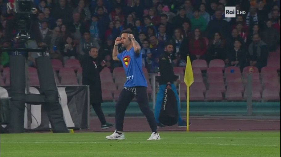 Sciarpa in faccia ad Higuain, boato della Curva e una multa di 35.000 euro per la SSC Napoli responsabile di non essere riuscita a contrastare l’azione di Ferri che da 10 anni esegue alla perfezione invasioni di campo indossando la maglia di superman.