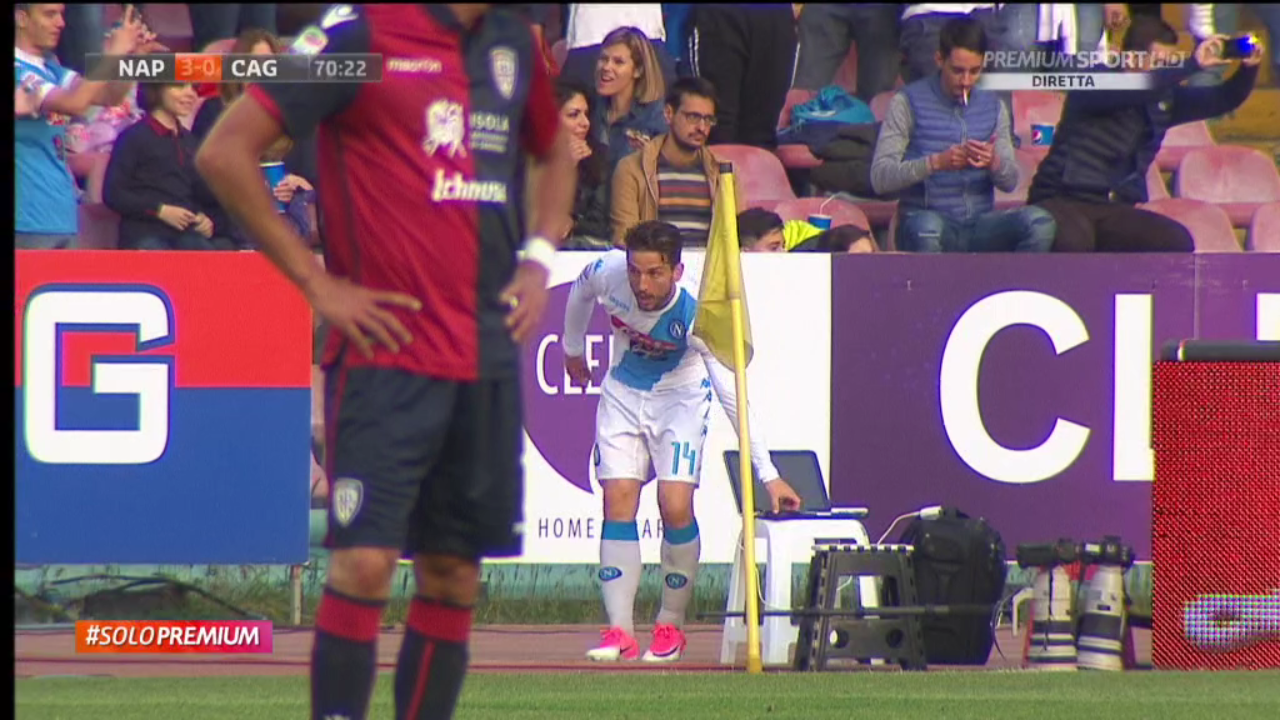 Durante i festeggiamenti per il terzo gol del Napoli, Mertens, senza farsi vedere, prende il cellulare di un fotografo e lo nasconde nei pressi della bandierina. Chissà se il povero fotografo riuscirà mai a ritrovarlo!