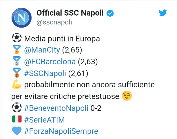Ieri al termine della partita contro il Benevento vinta dal Napoli per un netto 2 a 0, la SSC Napoli attraverso un tweet replica alle critiche del calciomercato con numeri sbalorditivi.
