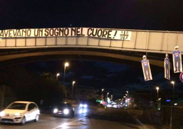 Quello che si è potuto vedere ieri a Mondragone, in provincia di Caserta, è stato un vero scempio e un gesto sporco e antisportivo. Alcune persone, quasi sicuramente juventini, hanno esposto su un ponte alcuni manichini impiccati con indosso le maglie del Napoli e le maschere di Pulcinella con uno striscione che ha reso chiarissimo chi fossero i destinatari di questo scherzo di cattivo gusto: “Avevano un sogno nel cuore”.