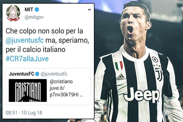Sono bastate poche ore per far scatenare i tifosi di tutta Italia. Cristiano Ronaldo è un nuovo calciatore della Juventus. In molti hanno esultato a questa clamorosa notizia, anche il Ministero dei Trasporti. Già, perché nell’epoca dei social network e dei “cinguettii”, capita pure che un profilo istituzionale si dedichi (per errore) ad argomenti più “profani”.