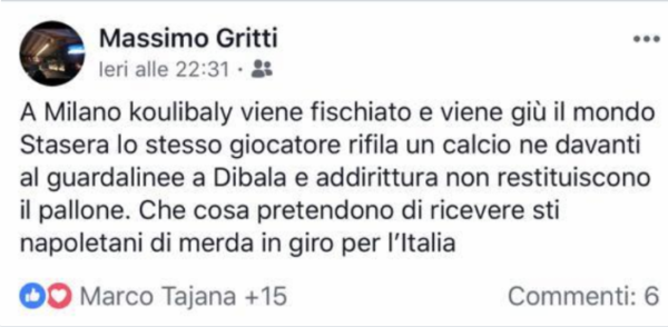 Un post che, per molti, è di chiara matrice razzista. Non si capisce come mai un episodio che avviene in campo debba essere non solo il pretesto per insultare i napoletani, ma anche per giustificare episodi di discriminazione contro di essi.
