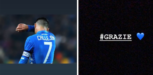 Ed è così che Marta ha deciso di pubblicare ben due storie sul proprio profilo ufficiale Instagram: la prima ritrae Callejon con la maglia del Napoli, di spalle, con l’aggiunta di un cuore rosso. La seconda è la semplice scritta #GRAZIE con un cuore non a caso azzurro.