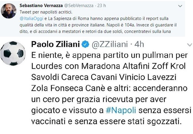 Immediato il tweet di risposta a Vernazza del collega del Fatto Quotidiano, Paolo Ziliani: «E niente, è appena partito un pullman per Lourdes con Maradona, Altafini, Zoff, Kroll, Savoldi, Careca, Cavani, Vinicio, Lavezzi, Zola, Fonseza, Canè e altri: accenderanno un cero per grazia ricevuta per aver giocato e vissuto a Napoli senza essersi vaccinati e senza essere stati sgozzati».