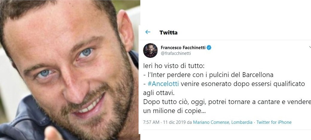 Sono in tanti, tra gli estimatori di Carlo Ancelotti, a non aver gradito la decisione. Tra costoro c’è Francesco Facchinetti, personaggio che tra l’altro ha sempre dimostrato di provare un particolare attaccamento verso la città di Napoli, il quale su Twitter ha scritto: