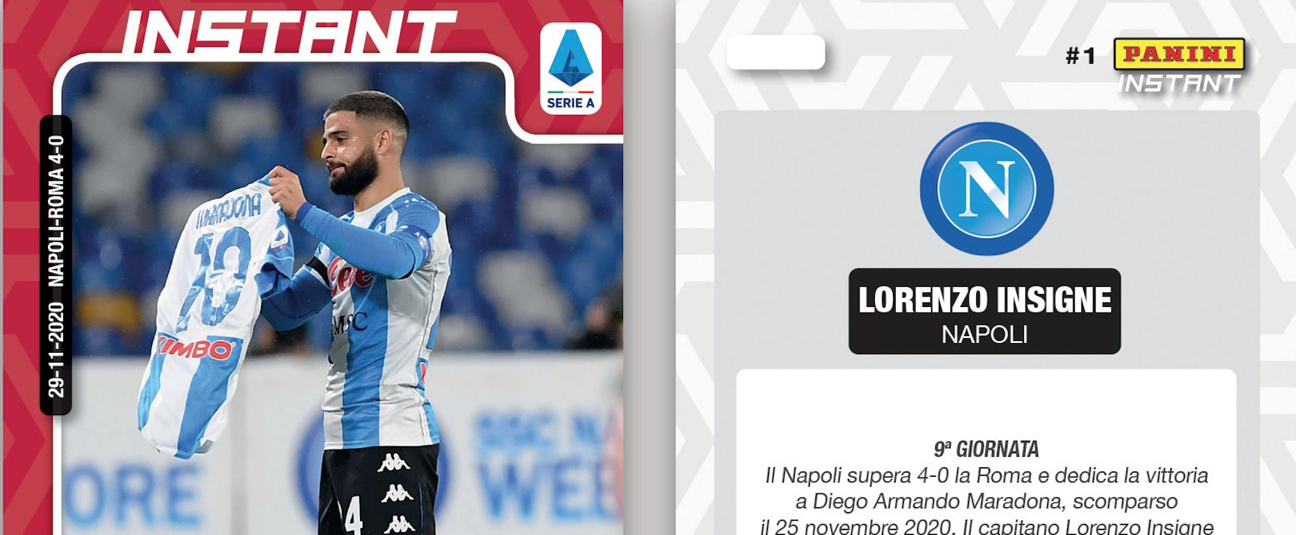 Sul retro della prima “Panini Instant”, l’azienda modenese ha evidenziato il motivo di questo omaggio al capitano del Napoli: in occasione della partita contro la Roma del 29 novembre scorso, vinta 4-0 dalla compagine partenopea, proprio Insigne ha aperto le marcature con una precisa punizione e poi ha baciato la maglia numero 10 di Diego Armando Maradona. Questa speciale card può essere acquistata solo sul sito a partire da oggi ed entro e non oltre le ore 12 del 10 dicembre 2020. Sarà un’edizione a tiratura limitata, che verrà dichiarata da Panini sulla base delle richieste ricevute dagli appassionati entro la scadenza e anche stampata sulla stessa card.