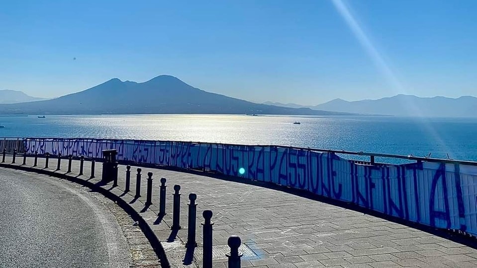 “Auguri compagna di vita, resti sempre la nostra passione infinita” – si legge nella dedica dei tifosi napoletani, raccolta in uno striscione lunghissimo, con il Vesuvio e il mare alle spalle. Un modo per celebrare una data speciale che segna l’inizio di una storia che dura da quasi cento anni.