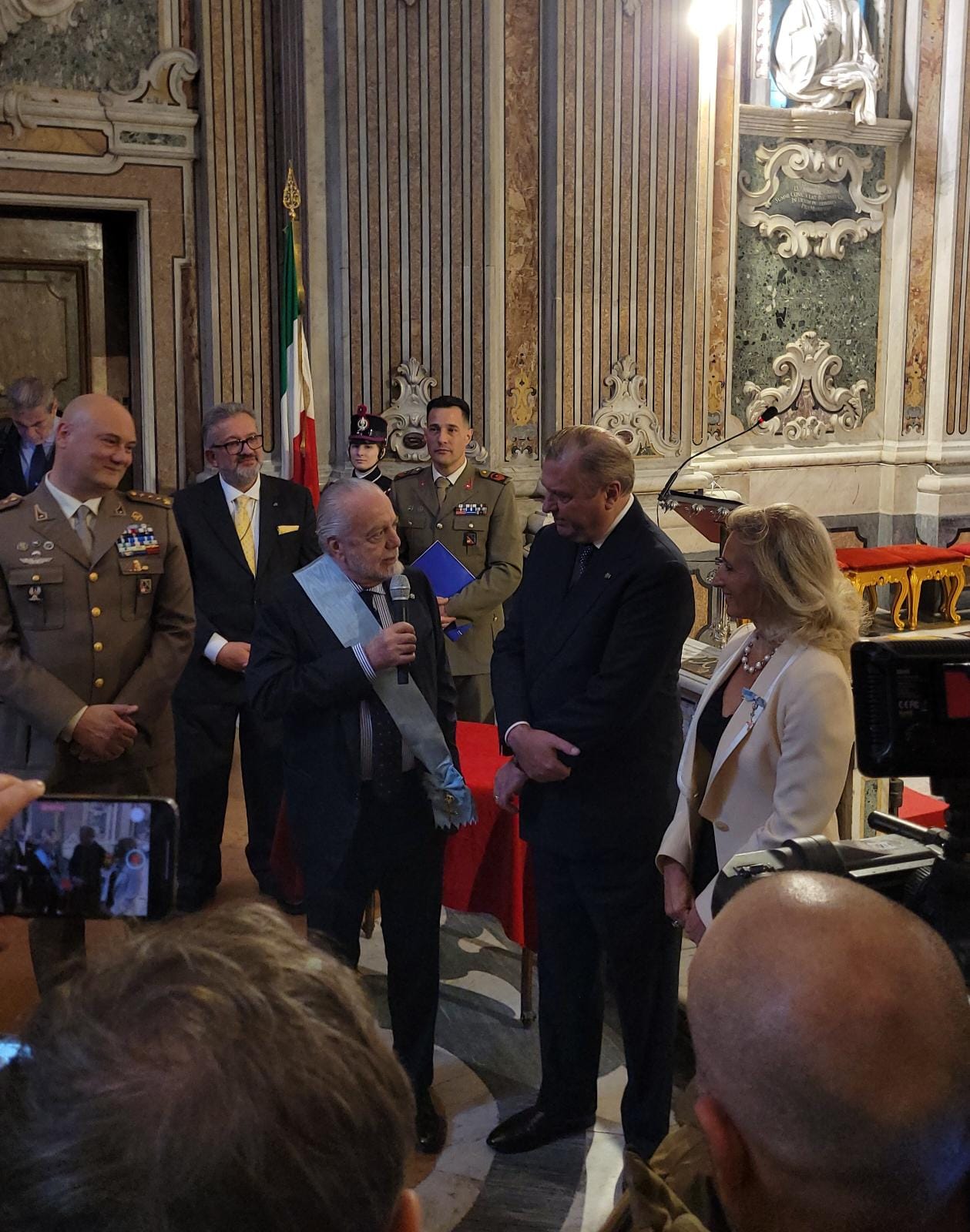 Nella meravigliosa cornice della Scuola Militare Nunziatella, Don Aurelio De Laurentiis, presidente del Calcio Napoli scudettato, accompagnato dalla moglie Jacqueline, ha ricevuto il titolo di Cavaliere di Gran Croce di Merito del Sacro Militare Ordine Costantiniano di San Giorgio dalle mani del Principe Carlo di Borbone delle due Sicilie, Duca di Castro, capo della Real Casa e Gran Maestro dell’Ordine.