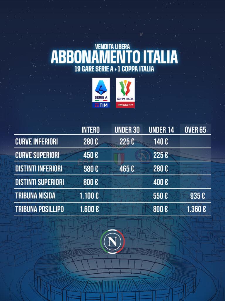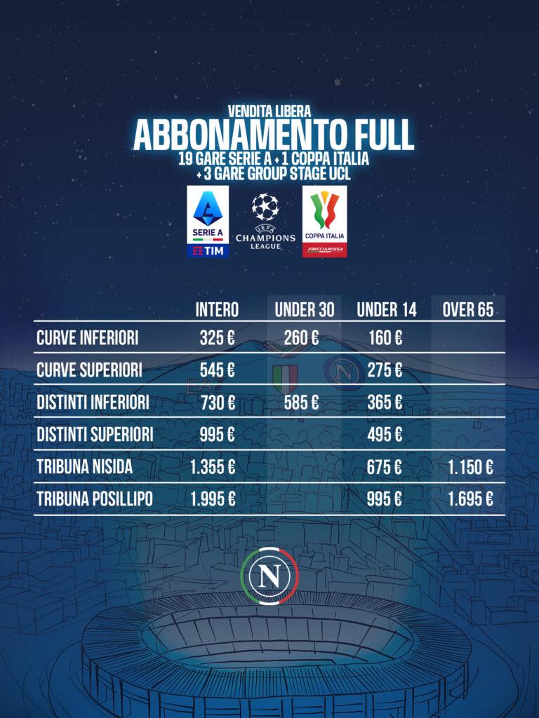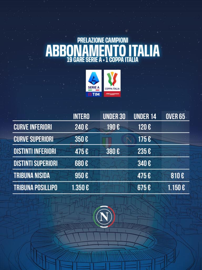 I primi giorni di vendita saranno riservati a tutti gli Abbonati 22/23 che potranno godere della promozione “Campioni”, esercitando un diritto di prelazione sul proprio posto e usufruendo di uno sconto sul prezzo intero dell’abbonamento. Da Mercoledì 2 Agosto, invece, inizierà la vendita libera aperta a tutti i Tifosi azzurri.