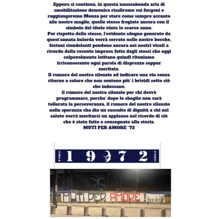 Quindi riteniamo irriconoscente ogni parola di disprezzo, seppur meritata. Il rumore del nostro silenzio ad indicare una via senza ritorno a coloro che non sentono più i brividi sotto ciò che indossano, il rumore del nostro silenzio per chi dovrà programmare, perché dopo lo sbaglio non sarà tollerata la perseveranza, il rumore del nostro silenzio nella speranza che dia un sussulto di dignità a chi nel saluto vorrà meritarsi un applauso nel ricordo di ciò che è stato fatto e consegnato alla storia. Muti per amore, Ultras 1972″.
