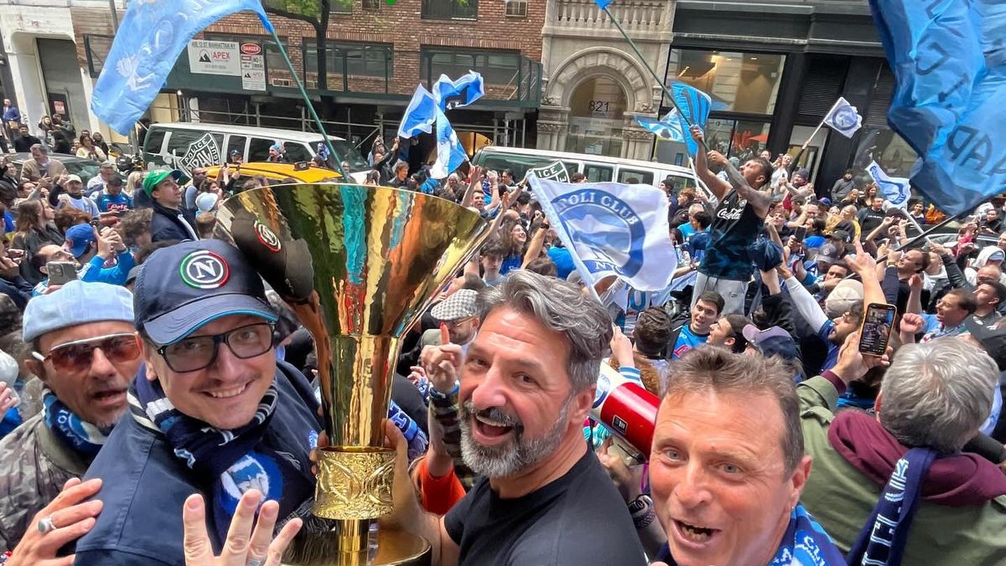 Non solo Italia ed Europa: tra bandiere, coppe, striscioni e maglie azzurre, anche New York si è trasformata in una piccola Napoli, accogliendo la folla di tifosi e curiosi pronti a gioire per i loro idoli sportivi. Protagonisti i membri del Napoli Club NYC, il club americano dei tifosi della SSC Napoli.