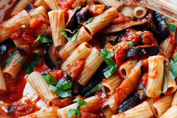 Intanto lavare e asciugare le melanzane, tagliarle a dadini, friggerle in abbondante olio bollente e poi lasciarle asciugare su carta da cucina. Quando il sugo e le melanzane saranno pronti, far bollire l’acqua in una pentola alta, calare la pasta e aggiustare di sale e lasciar cuocere il tempo necessario.