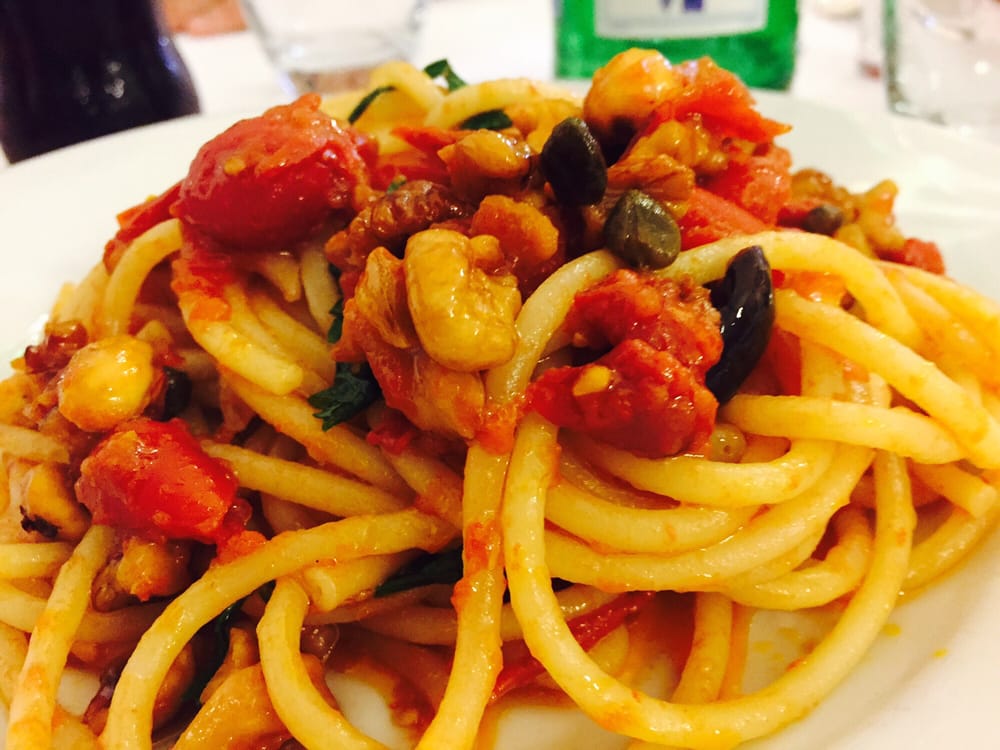 Portare a bollore una pentola alta d’acqua, far cuocere gli spaghetti, scolarli al dente e saltarli in padella con il sugo preparato in precedenza.