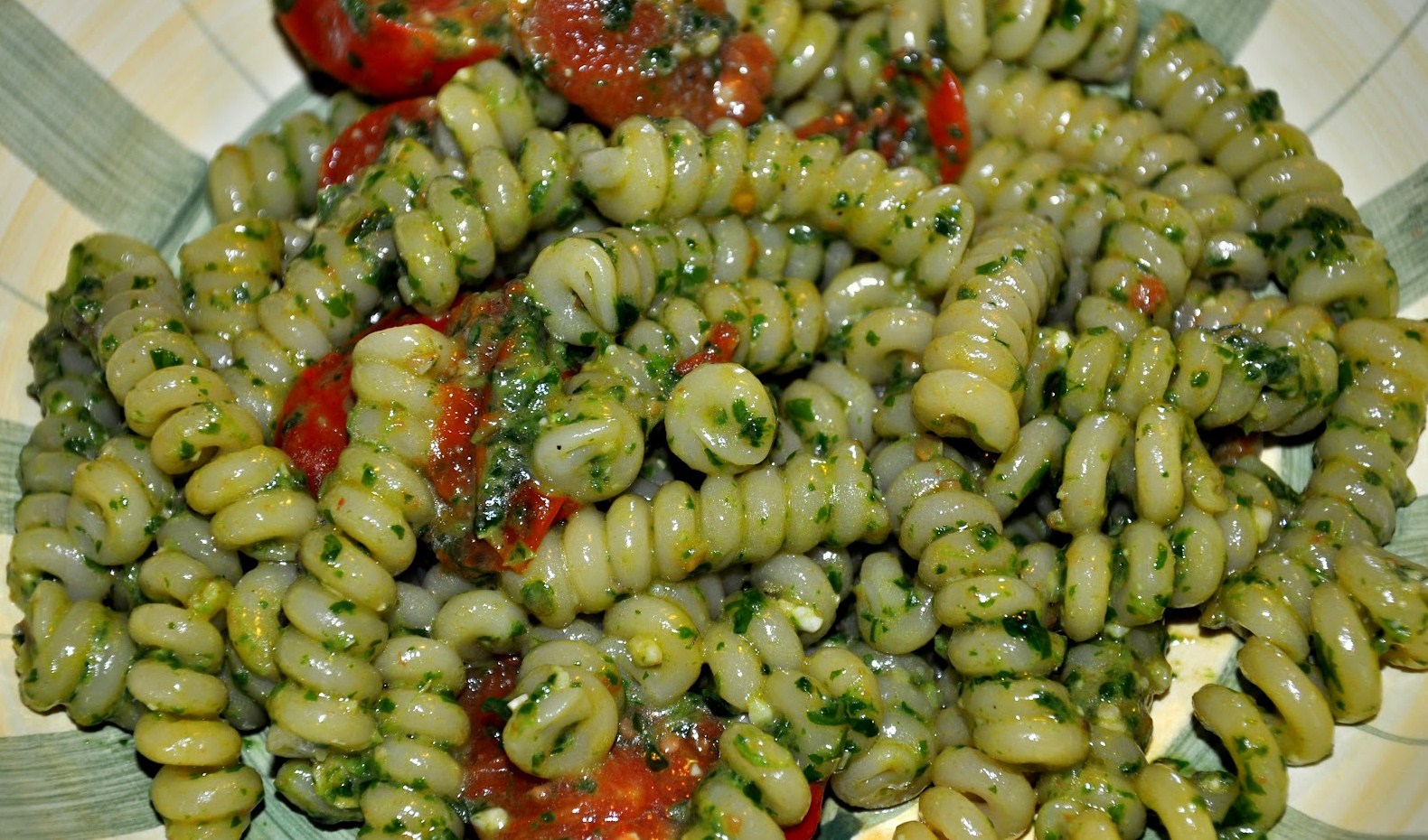 Unire il pesto e la salsa, aggiungere un po’ di peperoncino e poi condire i tubettoni nel sugo ottenuto.