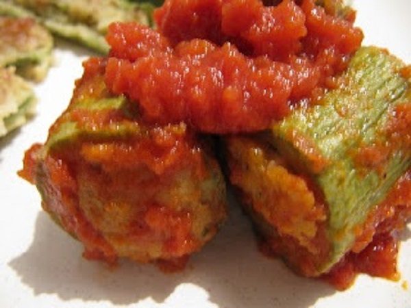 Lavorare tutti gli ingredienti fino a che risultino bene amalgamati e poi procedere ad imbottire i cilindri di zucca, precedentemente sbollentati e lasciati ad asciugare su di un canovaccio da cucina, per eliminare l’acqua in eccesso.