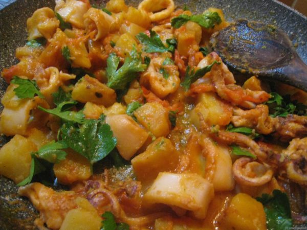 Lasciate “scoppiettare”. Quando i totani risulteranno privi della loro acqua, spruzzare con il vino e fare evaporare. A questo punto unite i pomodorini e lasciateli cuocere insieme ai totani per altri dieci minuti circa. Unite le patate ai totani. Salate. Coprite la padella e lasciate cuocere a fiamma moderata altri dieci minuti. Infine, unite il prezzemolo tritato e servite condito con olio d’oliva.
