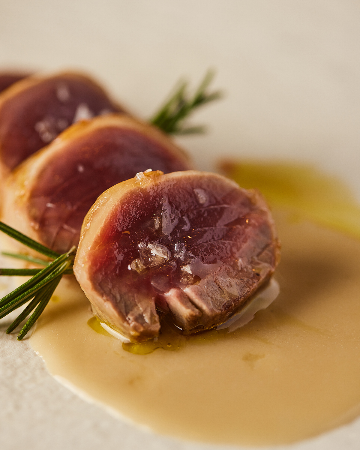 Tonno rosso scottato, vellutata di ceci, olio al rosmarino e tarallo sbriciolato